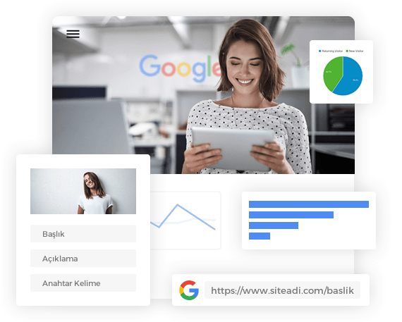Web sitenizin Google'da üst sıralarda yer alması için gerekli site içi ayarlamalar otomatik olarak ayarlanır. Web siteniz; mobil uyumluluk, SEO uyumlu linkler, özel SEO alanları, görsellerin kendi alan adınızda yayını, site haritası, Og:image desteği, Google webmaster tools, analytics, re-marketing alanları gibi birçok özelliğe sahip olur.